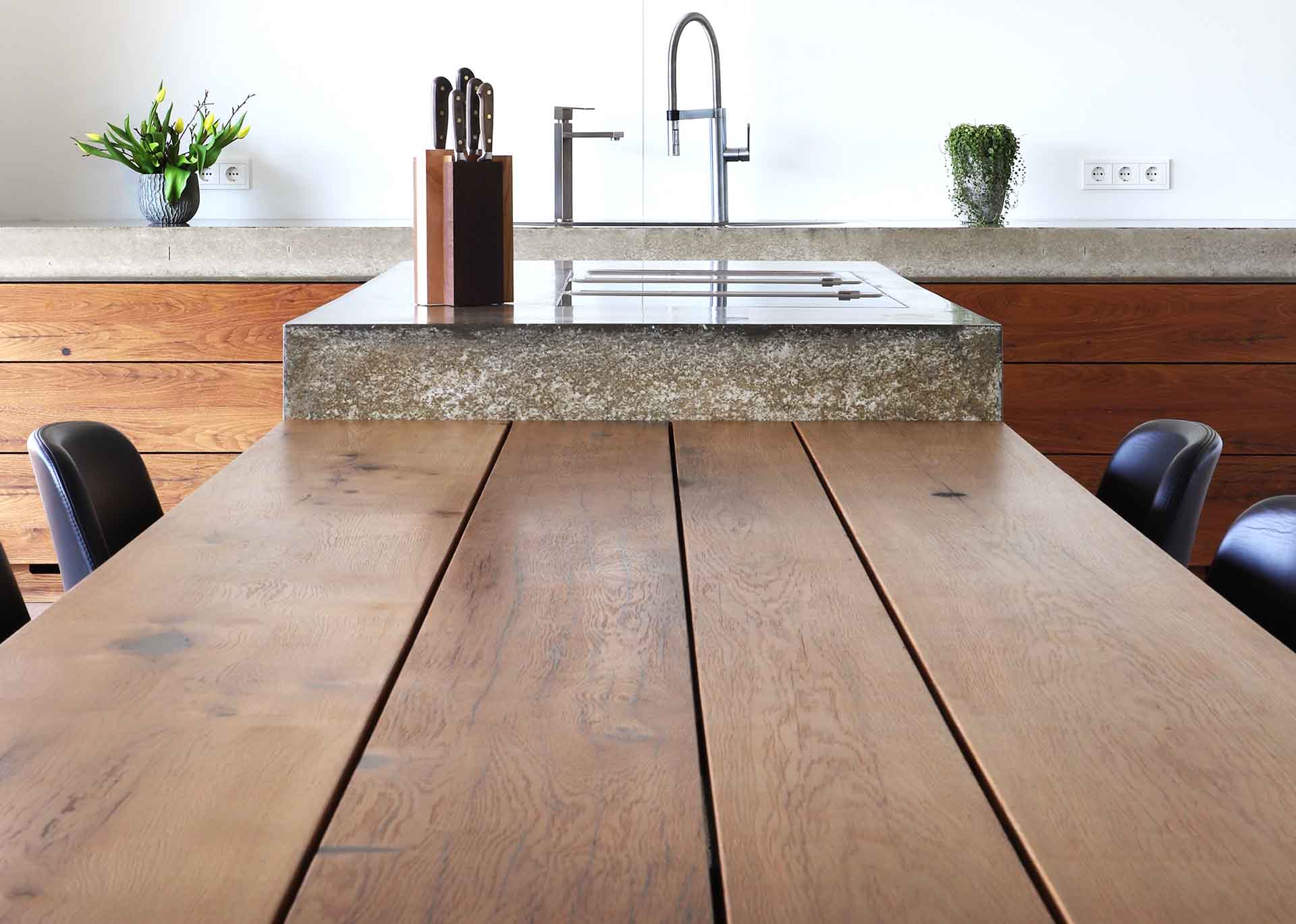 Maximale Passion und Funktionalität steht hinter dem Konzept dieser Küche von GIGLER holz-design. Als Knotenpunkt des Wohnkonzeptes fungiert sie im alltäglichen Zusammenleben als natürlicher Ort der Begegnung. Der Massivholztisch – als Verlängerung des Küchenblocks aus poliertem Beton – lädt dabei zu einem gemeinsamen Miteinander ein. Die vollflächige Schrankwand integriert sich charmant in das Wohnkonzept und garantiert zugleich optimale Funktionalität und platzoptimierten Stauraum. Das Design unterstützt apart die Abläufe im Küchenalltag und gibt Platz zum Kochen und Wohlfühlen. Das Zusammenspiel der unterschiedlichen Materialien – aus Holz, Beton und Glas – ist eine visuelle und funktionelle Glanzleistung. Das Dessert dieses Küchenschmauses offeriert hierbei die Glasfront auf ganzer Länge des Raumes: den Ausblick auf das traumhafte Voralpenland.